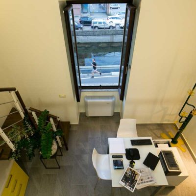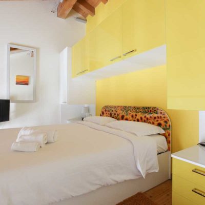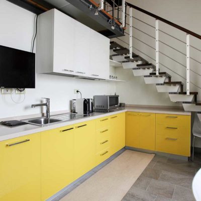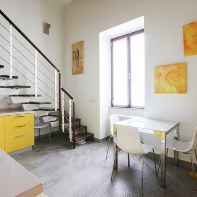 Loft-Wohnung mit Blick auf den Naviglio Grande, mit King-Size-Doppelbett (180 cm) auf dem Dachboden, Küche mit Esstisch, Kaffeemaschine, Herd, Backofen, Küchenutensilien und eigenem Bad mit Haartrockner, Handtüchern und kostenlosen Toilettenartikeln im Erdgeschoss.