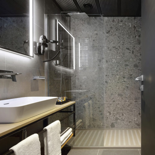 Private bathroom with shower, hair dryer, towels and toiletries.