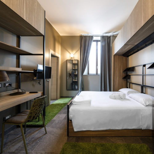 Desk area with flat-screen TV, minibar, safe and telephone.