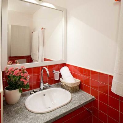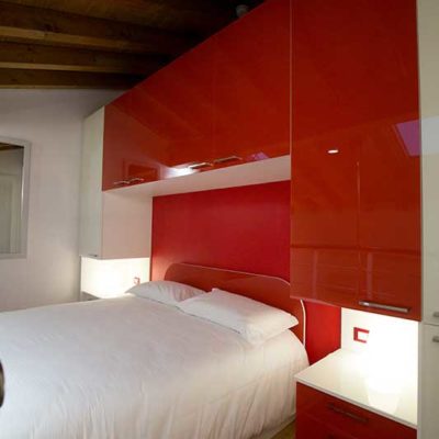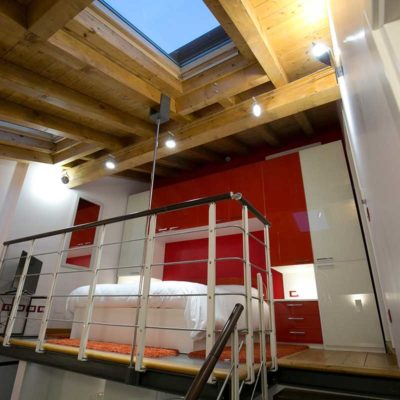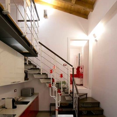 Appartement loft avec vue sur Corte Lombarda, avec lit double King size (180 cm) sur la mezzanine, cuisine équipée avec table à manger, cafetière, plaque de cuisson, four mixte, ustensiles de cuisine et salle de bain privée avec sèche-cheveux, serviettes et articles de toilette.