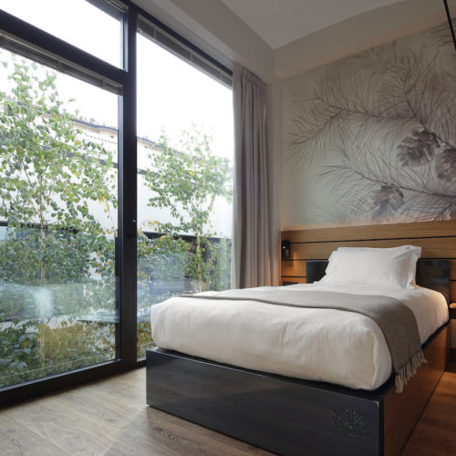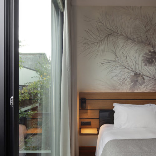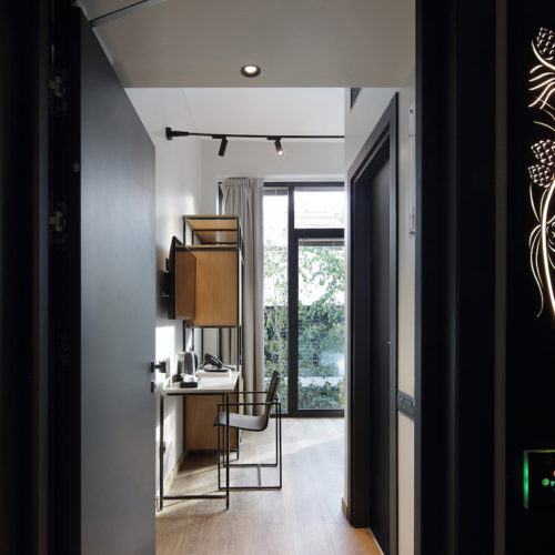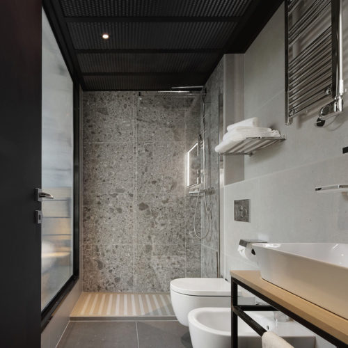 Salle de bains privée (toujours bien éclairée grâce à la paroi en verre cannelé raffiné qui la sépare du reste de la chambre) avec douche, sèche-cheveux, serviettes et articles de toilette.